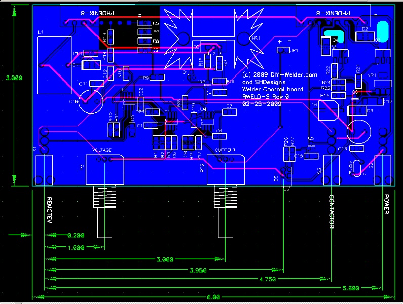 Been busy and have not had time or money to work on this. Now have gotten back to it. I have the "simplified" board laid out and am doing final design rule checks. This will be a simpler version with a voltage and current knobs, contactor, remote voltage and power switches. It is also a right-angle board so it uses a small front panel. It can control an external contactor relay and gas solenoid. Below is the layout: