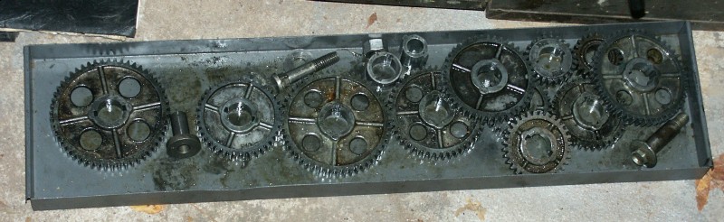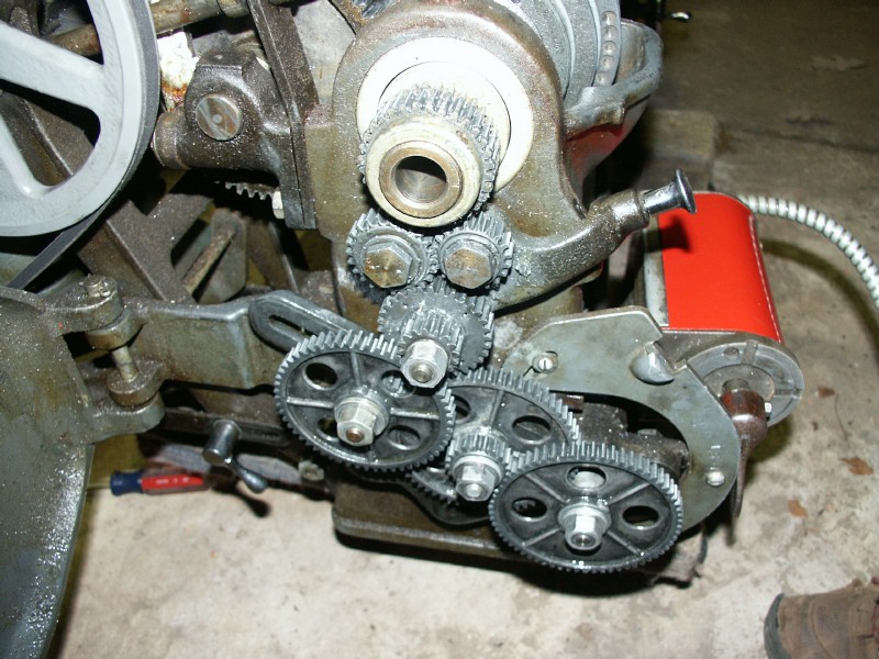 Main gears, look clean. Has roller head bearings. Has link belt for vibration-free operation. Pully cover was broken off at one point and brazed back on. Works fine, needed to add a washer so cover closes straight. |
