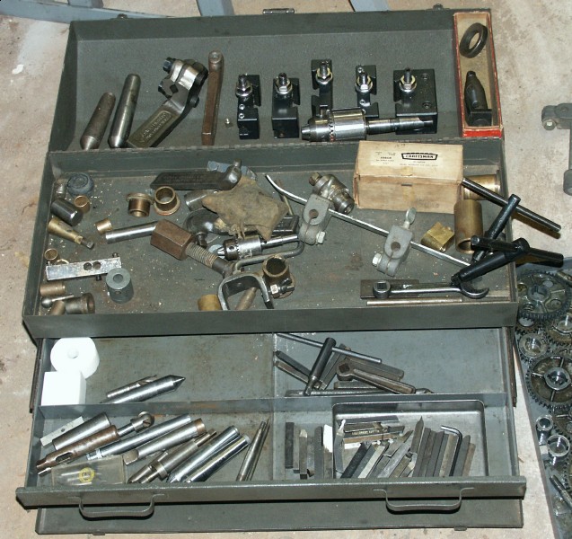 Unknown tool holder, may be for a dial indicator, Milling attachment, face plate, original pulley, collette adapter 2 lathe dogs, ball/radius turning attachment 5" 3-jaw chuck and 6" 4-jaw chuck. These two are worth more than what I paid for everything. |