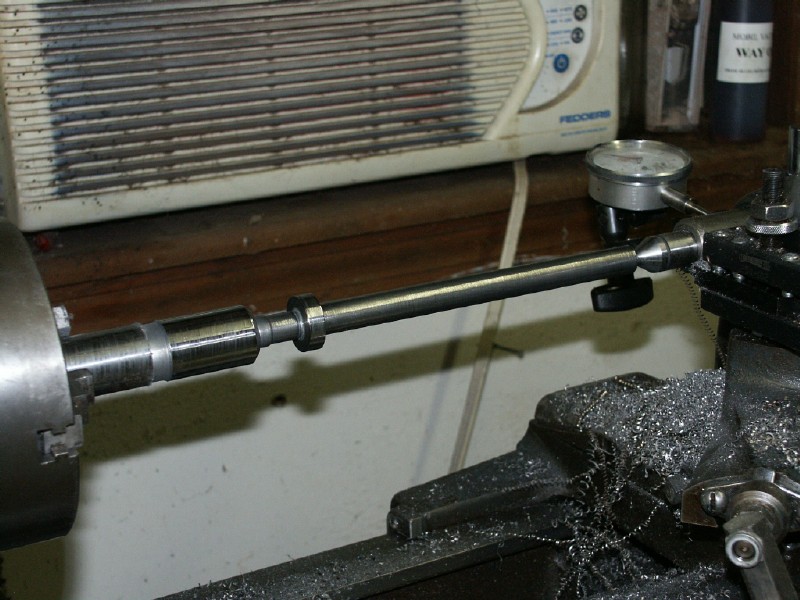 Turning a new spindle for my old 109 lathe. Made from 1" tool steel This is the cut on the 0.551" section almost finished. Used back gear and a slow feed. Each pass took about 12 minutes. As this was tool steel, needed to go slow to prevent work hardening. |