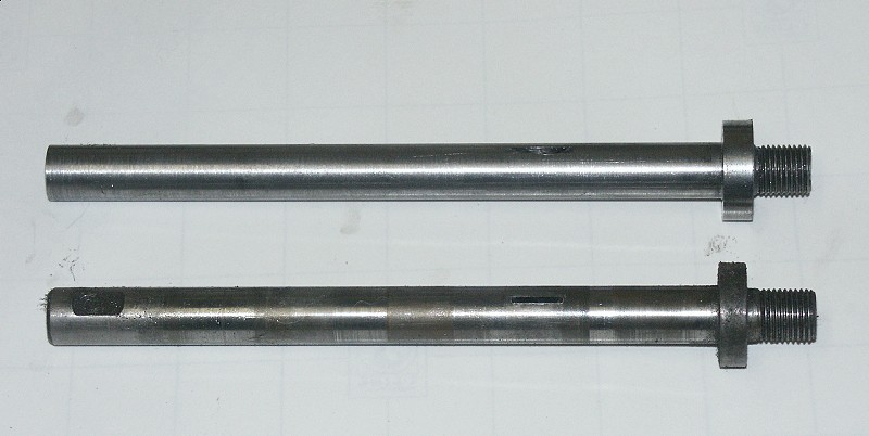 Completed spindle on top, old on bottom. Still needed to grind notch for set screw. Came out well. The tool steel relaxed a bit and there is a bit of warp, but it was adjusted for by turning the face of the spindle on with it mounted in the old lathe. Final diameter was 0.550 instead of 0.551". Was my error of measuring it warm after turning. |
