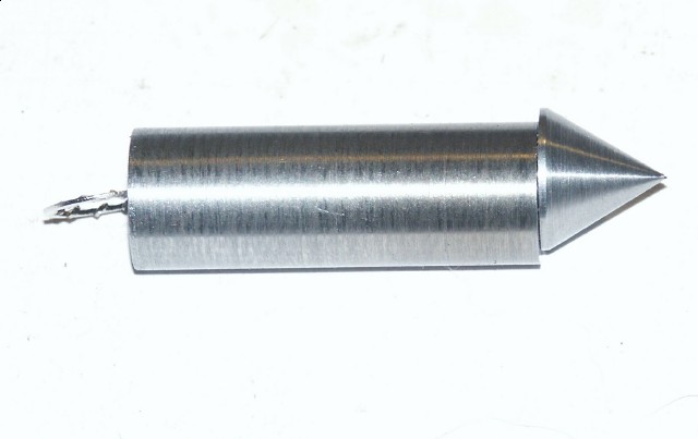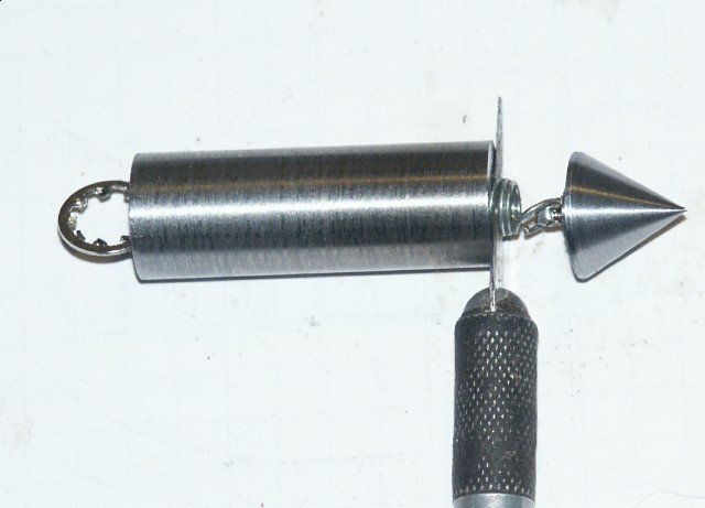 This shows the spring held out with an Exacto knife.. Just a washer on the other end, will probably turn a cap with a slot for the spring. Still need to put under magnifying glass and file point center. To use the tool, mount it in a chuck or collet holder. Then the point goes in a drilled hole or center punch. With your fingers, you will be able to feel the ridge between the two halves if the tip is not centered (top photo shows point about .030 off.) Will be a quick way to re-center the tail stock. Center-drill some stock; insert tool in tail chuck. bring tail up to the stock and adjust tail stock Gibbs until you can't feel any edge. It can also be used in a drill press. Use a punch to mark holes, use tool to locate the chuck exactly over the hole. This is supposed to be accurate to about 0.002" Using this tool, I centered my tailstock and did a test cut. I got less than 0.0005" taper. |