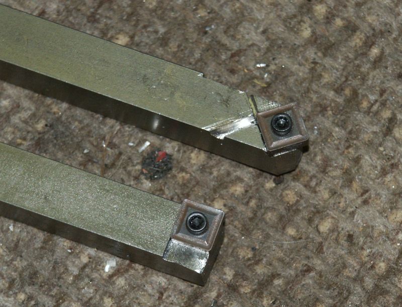 Here are some indexed tool holders made from 1/2" square 304 stainless bar Inserts are Broussard SNMG322, picked up off Ebay. These were made without using the milling adapter. The bar was milled in the tool holder. Back of notch was cut using a hack saw then end milled with a milling bit. The bits are a bit small, could have used 422 inserts. These insets have no clearance angle. So, the finish was not good. I filed the slits so the inserts sloped down a few degrees. The resulting cut is much cleaner and less chance of chatter. The "xNxx" type of inserts are the most common. If you watch videos of people using inserts on large machines, you can see the inserts are angled down a bit. Inserts with chip breakers also act as a rake angle. This helps reduce cutting forces besides curling up the chips. |