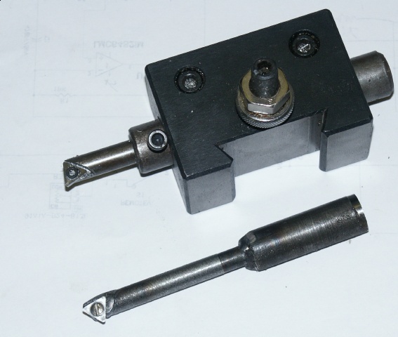 Here are two boring bars I made using carbide inserts. The lower one was the first one. It works ok but it is a bit thin for its length and is non-adjustable. So, it tends to "sing" when used causing a rough surface. The angle of the bit is not ideal for boring where you don't go all the way through. The upper one has a better grade steel and is stiffer. I turned and adapter to allow it to fit the AXA boring bar holder. The adapter allows the length to be adjusted as needed. It can also turn a bore that is not a through-bore. These are easy to make. For the upper one, First use a hack saw to cut a 45 degree angle half-way through the bar. Then cut from the end to the cut. Place the insert on the notch and mark the hole. Drill and tap. These use #4-40 screws. My other inserts use #2-56. The upper one is a Allen-head cap screw. They work best. Use a bit of thread lock on the screws as the chatter will shake them loose in no time. |
