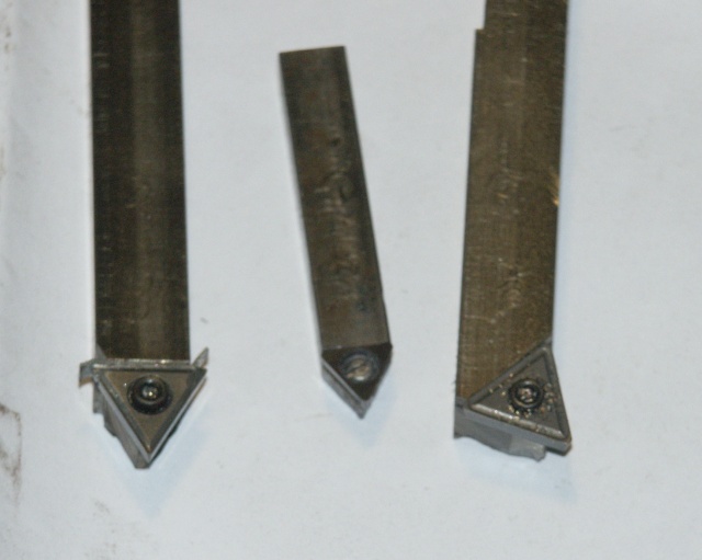 Here's some more home-made insert holders for triangle inserts. Left and right are 422 size and center is 322 size. I think they were TPMG type. |