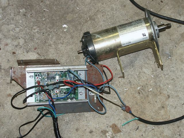 Neighbor threw out a Proform Treadmill. Needed new belt and control panel a bit beat up, but it worked. Took it apart and found the motor and controller basically worked standalone and did not need all the rest of the control panel. Only control is the speed pot. On the back of the controller is a choke. The controller is an MC-60 and is straightforward. Two AC in lines, +/- to motor and 3 lines to the speed pot. The motor is 130VDC, 2 1/4HP, 6500 RPM. With the controller, it looks to only reach about half speed. |
