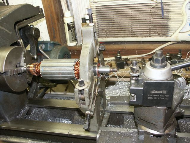 Shaft is an odd size and too big for the drill press pulley. So it was chucked up in the lathe. The bearing worked well with the steady rest. End of shaft was turned down to 1/2" |
